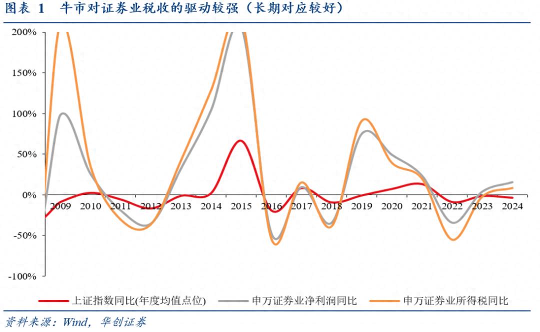 逻辑:券商等金融机构的经纪、自营、资管等业务收入大幅增长:如图1~2显示,根据历史经验,牛市对证券业税收的驱动较强、提振较大。