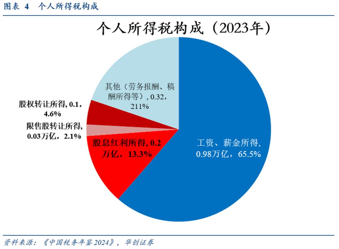 第一步,测算2024年个税资本市场分项或约2900亿。根据《中国税务年鉴2024》,2023年股权转让、限售股转让、利息股息红利所得个人所得税分别为696亿、322亿、2000亿,合计占个人所得税约20%;假设2024年占比均不变,可得2024年三项个税资本市场分项或分别为:673亿、311亿、1934亿(合计2918亿)。