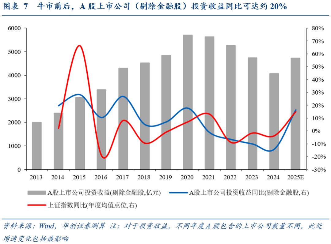 对于非金融企业,历史上,牛市前后,A股非金融企业投资收益同比可达约20%(作为参考,2024年A股上市公司贡献了全国企业所得税收收入的30.18%)。