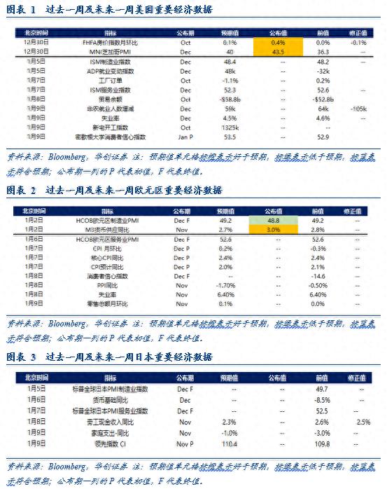 1月5日-9日当周,重点关注:美国:去年12月ISM制造业PMI(1月5日)、去年12月ISM服务业PMI(1月7日)、去年12月非农数据(1月9日)、1月密歇根大学消费者信心指数。欧元区:去年12月CPI初值数据(1月7日)、去年11月PPI和失业率(1月8日)、去年11月零售销售环比(1月9日)。日本:去年11月的劳工现金收入和家庭支出同比(1月8日)。