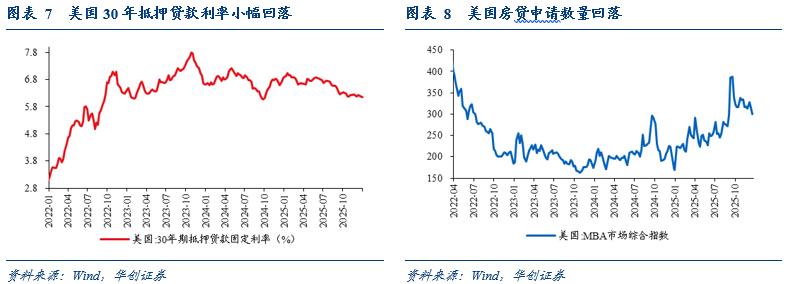 抵押贷款申请数量回落。2025年12月19日当周,美国MBA市场综合指数(反映抵押贷款申请数量情况)为299.8,环比-5.0%,前一周环比为-3.8%。