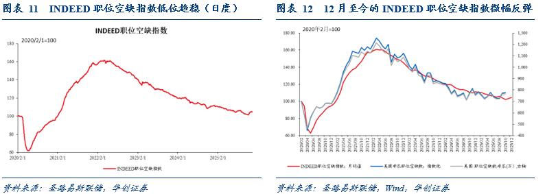 近期职位空缺数低位趋稳。截至2025年12月12日,INDEED职位空缺指数为104.66,较前一周环比-0.2%。12月至今的INDEED职位空缺指数均值为104.76,高于11月均值的103.22。