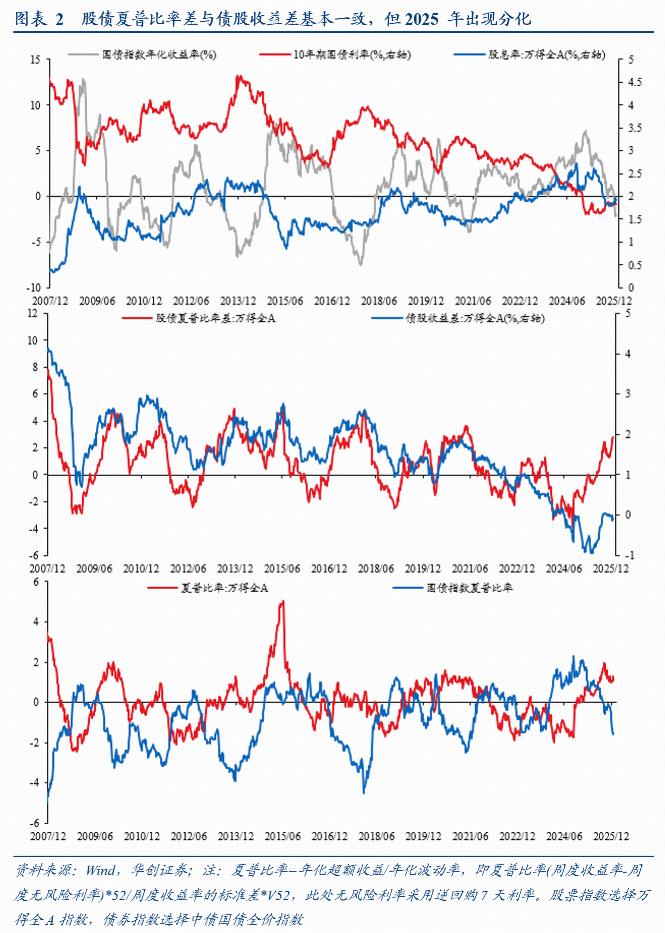 我们发现,历史经验来看,股债夏普比率差与债股收益差走势趋同。截至2025年12月26日,股债夏普比率差为2.81,超过9月中旬2.43的高点,处于历史相对高位(十年90.2%分位数),凸显出股票相对于债券的配置性价比。但债股收益差为-0.09%,处于历史低位(十年11.1%分位数),表明债相对于股依然偏贵。因而,我们认为,当前股相对于债依然有更高的配置价值。