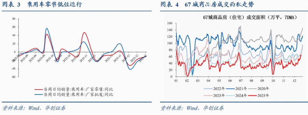 耐用品消费:乘用车零售低位运行。12月第三周,乘用车零售同比增速-11%,前值-17%。12月前三周累计同比-18.8%。11月全月同比为-8.1%。10月全月同比为+5.8%。