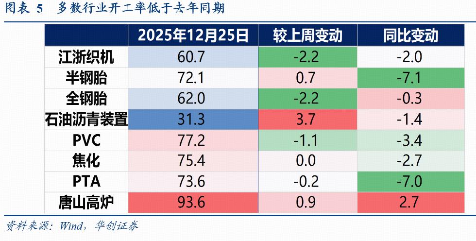 基建:高频数据略有改善。水泥发运率持平。截至12月19日,水泥发运率为31.6%,持平上周和去年同期。石油沥青装置开工率回升,截至12月24当周,开工率为31.3%,较上周环比回升3.7个点,较去年同期高5.4个点。