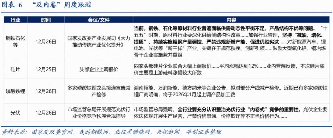“反内卷”跟踪:仍集中在传统行业和新能源,涉及钢铁石化等(发改委署名文章提出“坚持‘减油、增化、提质’,持续实施粗钢产量调控”)、硅片(头部企业涨价)、碳酸铁锂(龙头企业减产检修)、光伏(市场监管总局喊话“全行业要充分认识整治光伏行业‘内卷式’竞争的重要性”)。