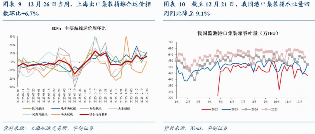3、中国出口运价:运输市场走势向好,远洋航线运价上涨。12月26日当周,上海出口集装箱综合运价指数环比+6.7%,上周环比为+3.1%。分航线来看,欧洲航线方面,本周运输需求相对稳定,即期市场订舱价格在签约季保持涨势,运价环比为+10.2%,上周为-0.3%。北美航线方面,本周美西、美东航线运价环比分别为+9.8%、+6.6%,上周分别为+11.9%、+67.3%。