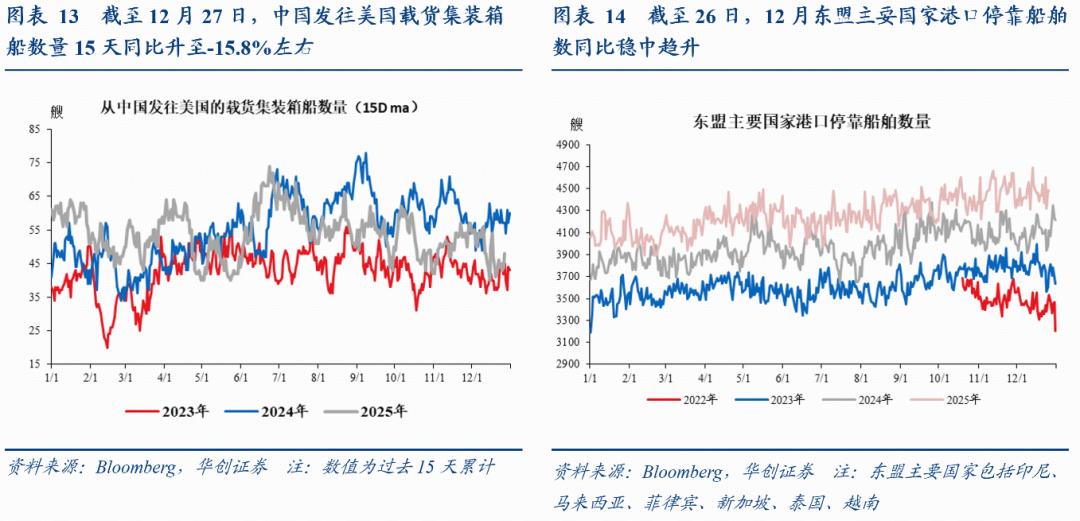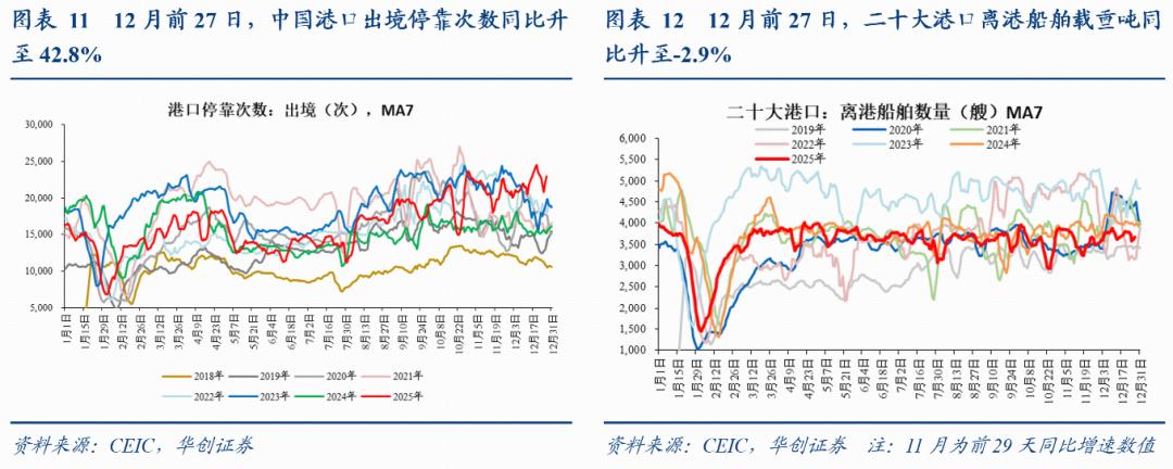 4、中美之间直接贸易流量:中国发往美国载货船舶数量同比低位反弹。截至12月27日,中国发往美国载货集装箱船数量15天同比-15.8%,上周(12月20日)同比为-29.3%,11月平均同比为-17.5%。