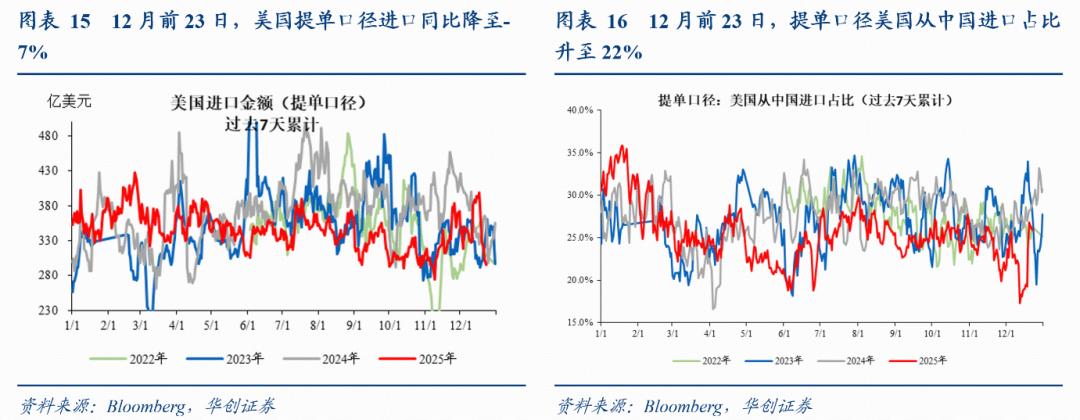 6、美国进口:整体进口回落,从中国进口占比底部反弹。12月前23天,美国提单口径进口同比-7%,上周为-2.3%,11月同比为-19%。12月前23天,美国提单口径从中国进口同比-27%,上周为-25.7%,11月同比为-26.1%。12月前23天,提单口径美国从中国进口占比升至22%,上周为20.8%,11月占比为23.5%。