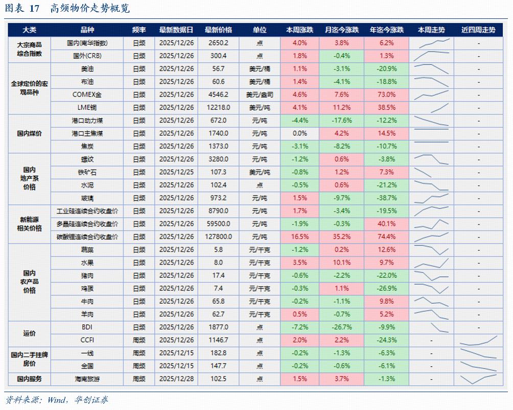 服务消费:地铁及航班变化不大。12月前25日,26城地铁客运量同比+3.1,环比上月-1.3%;11月同比为+3%。12月前27日,国内航班执行数日均为1.22万架次,同比+2%,环比11月-1.4%;11月日均为1.24万架次,同比+2.1%。
