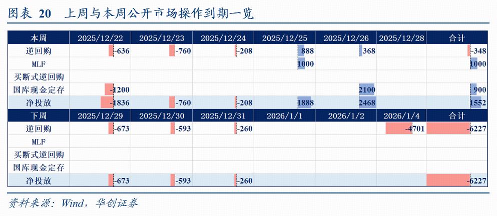 截至12月26日,DR001收于1.2556%,DR007收于1.5237%,R007收于1.5264%,较12月19日环比分别变化-1.5bps、+8.24bps、+1.16bps。本周央行逆回购+MLF净投放资金652亿,下周到期资金6227亿。