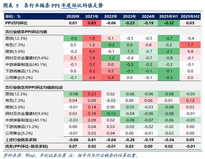 当下市场更关注PPI的环比(绝对价格水平的边际变化),对PPI的分析,我们从月均环比的角度来分析2025年的变化(也可以用年度或半年度累计涨幅,二者没有区别)。