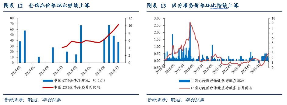 价格改善或走强的是哪些?其一,在果蔬和牛羊肉价格带动下,食品(1.1%)价格由跌转涨。其二,金价带动下,金饰品(68.5%)价格进一步走强。其三,宏观和消费品更新政策加力提效、产能治理带动市场竞争秩序不断优化,扣除成品油和金饰品的竞争性领域商品(0.8%)价格转涨,比如三类耐用品价格(0%)止跌、其他的广谱消费品价格(1.5%)涨幅回升,但酒类价格跌幅仍在扩大。其四,医疗改革效应显现,医疗服务价格带动政府管控类服务(1.3%,23-24年平均为1%)涨幅回升。