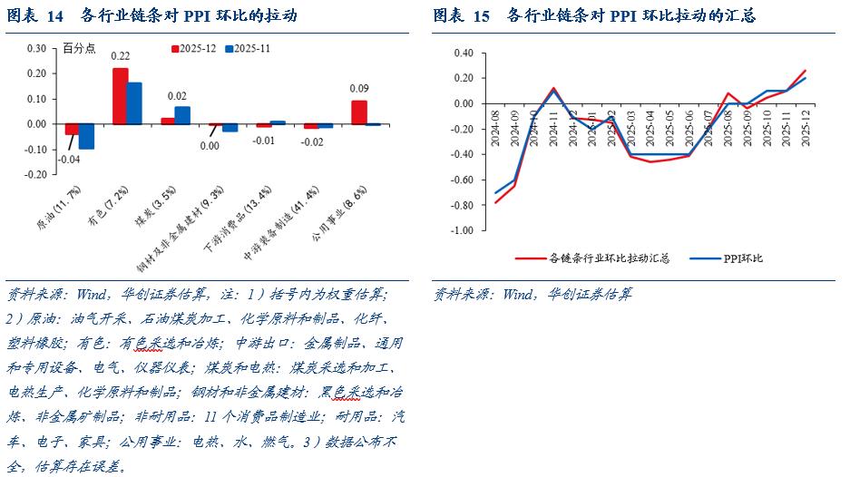 2025年下半年,国内外宏观因素共振,所有行业链条价格均明显边际改善,有色链条价格加速上涨,煤炭链条止跌转涨,下游消费品和公用事业链条止跌,原油、钢材和非金属建材、中游装备制造链条价格跌幅收窄。主要的影响因素包括:1)美国贸易政策不确定性的消退;2)国内重点行业产能治理,叠加两新政策和出口支撑下的需求韧性,中游供需格局加速改善;供给收缩预期也同步带动国内原材料价格边际回暖;3)宏观风偏回升,铜的关税及AI需求叙事进一步发酵;4)黄金加速上涨。