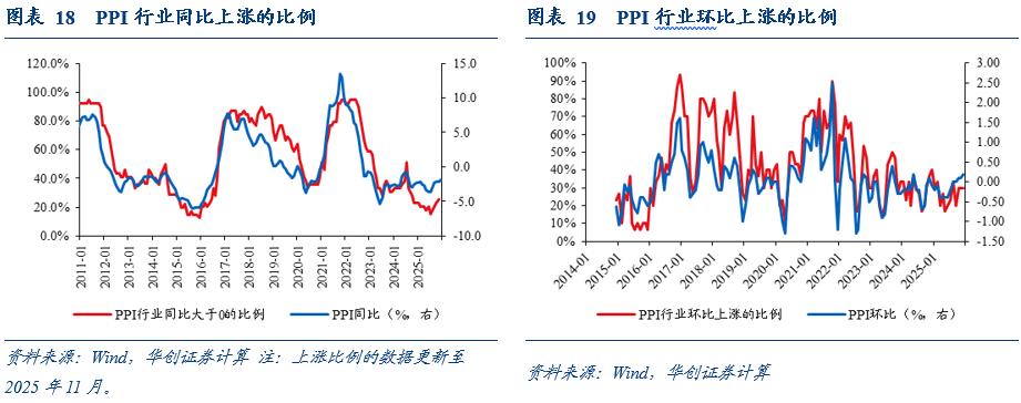 PPI行业的环比涨价比例持平,有可比数据的30个行业中,价格上涨的行业个数持平于9个,处于2013年8月有数据以来的30%分位。同比来看,39个行业中,2025年11月涨价个数为10个,10月为9个,处于2011年以来的16%分位。(2025年12月的行业PPI同比数据尚未完全更新)