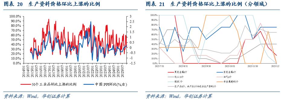 50个流通领域生产资料价格的环比涨价比例回落。2025年11月下旬至12月下旬,环比来看,涨价比例从54%降至46%,2014年以来的历史分位数从63%降至50%。黑色金属、煤炭、油气的涨价比例均有所回落,有色金属、化工、农林产品领域的涨价比例有所回升。